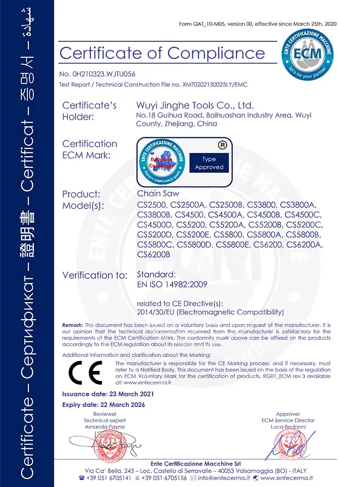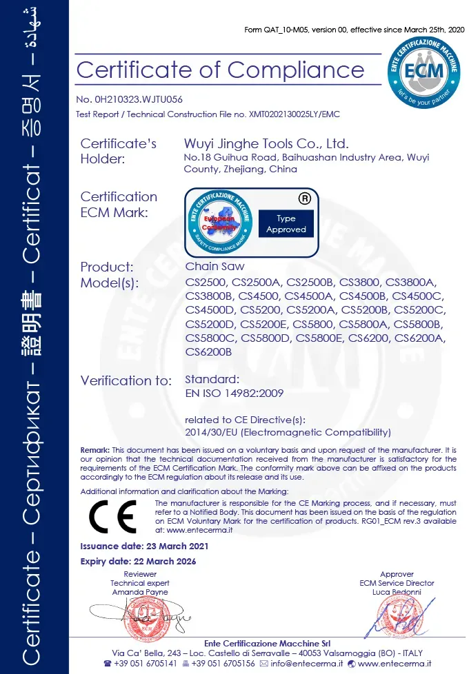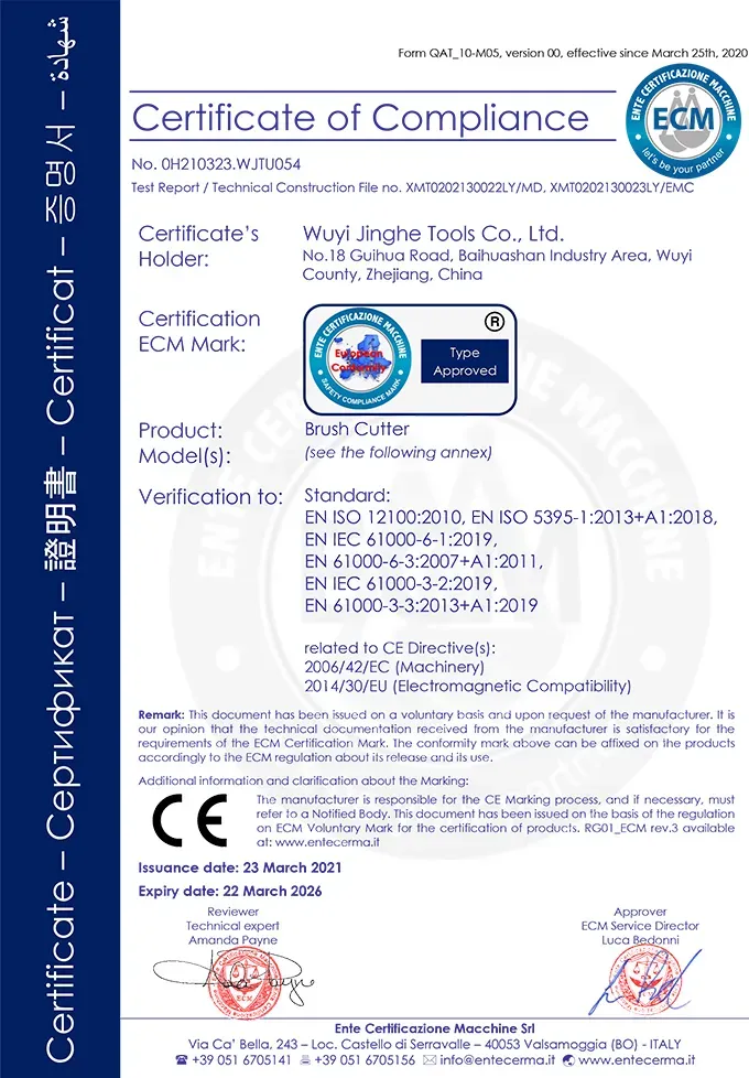 شهادات معتمدة، ضمان الجودة - لقد اجتازت جميع منتجاتنا شهادات نظام إدارة الجودة الدولية، وشهادات معايير السلامة، وشهادات حماية البيئة. وهذا يضمن أن كل قطعة من المعدات تلبي أعلى معايير الجودة، مما يوفر لك حلولًا موثوقة لأدوات الحدائق المهنية.